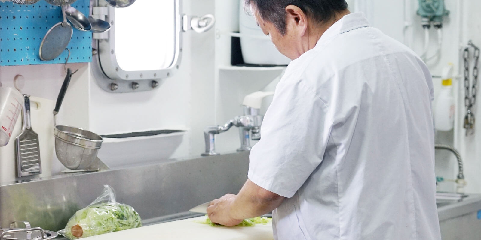 司厨部は司厨長1名で担当し、毎日の食事づくりを担当。その他にも離着岸の際の綱取りをサポートするなど、食事づくり以外も担当する。