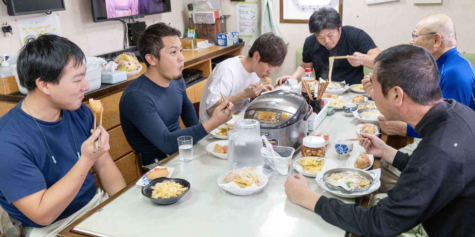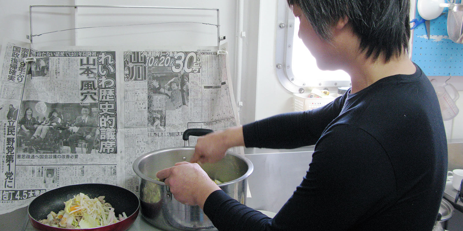 毎日の食事づくりから、離着岸の綱取りのサポートも担う司厨部