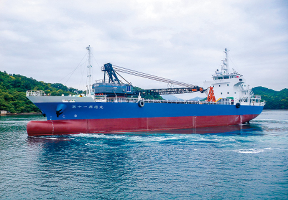 ガットとよばれるクレーンを備えた船舶で、荷役設備がない港でも土砂やタイヤチップなどのバラ貨物荷役が可能です。