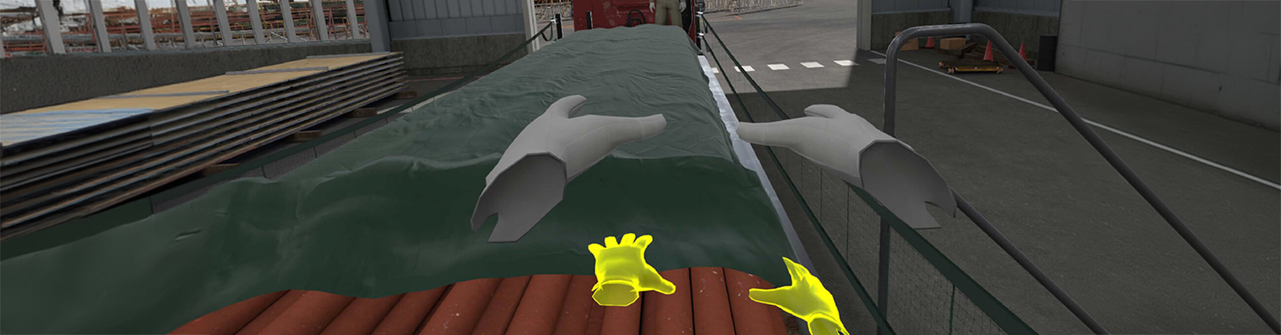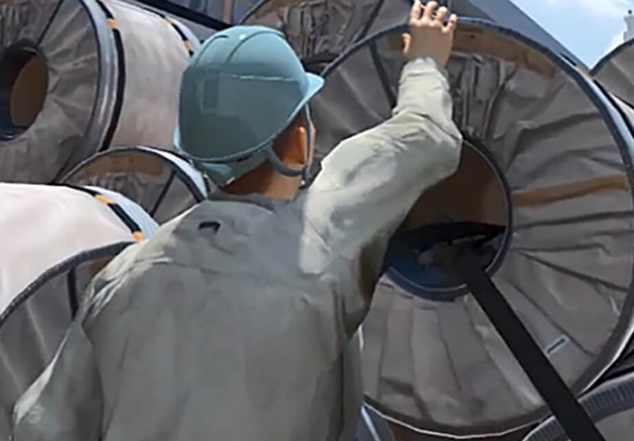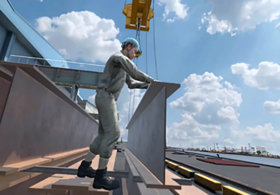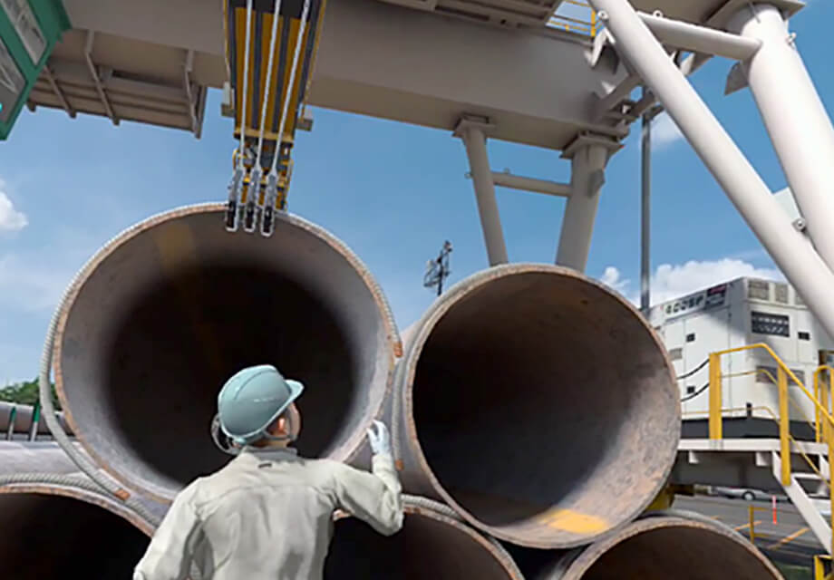 日鉄物流グループの安全教育では、VR技術を活用し座学では感じ得ない災害体感を行っています。現在は「車両荷台からの転落」「玉掛作業時の危険体感」「複数人作業の危険体感」「作業前KY(危険予知)」の教育項目を導入し、安全感度を向上させる取り組みを行っています。