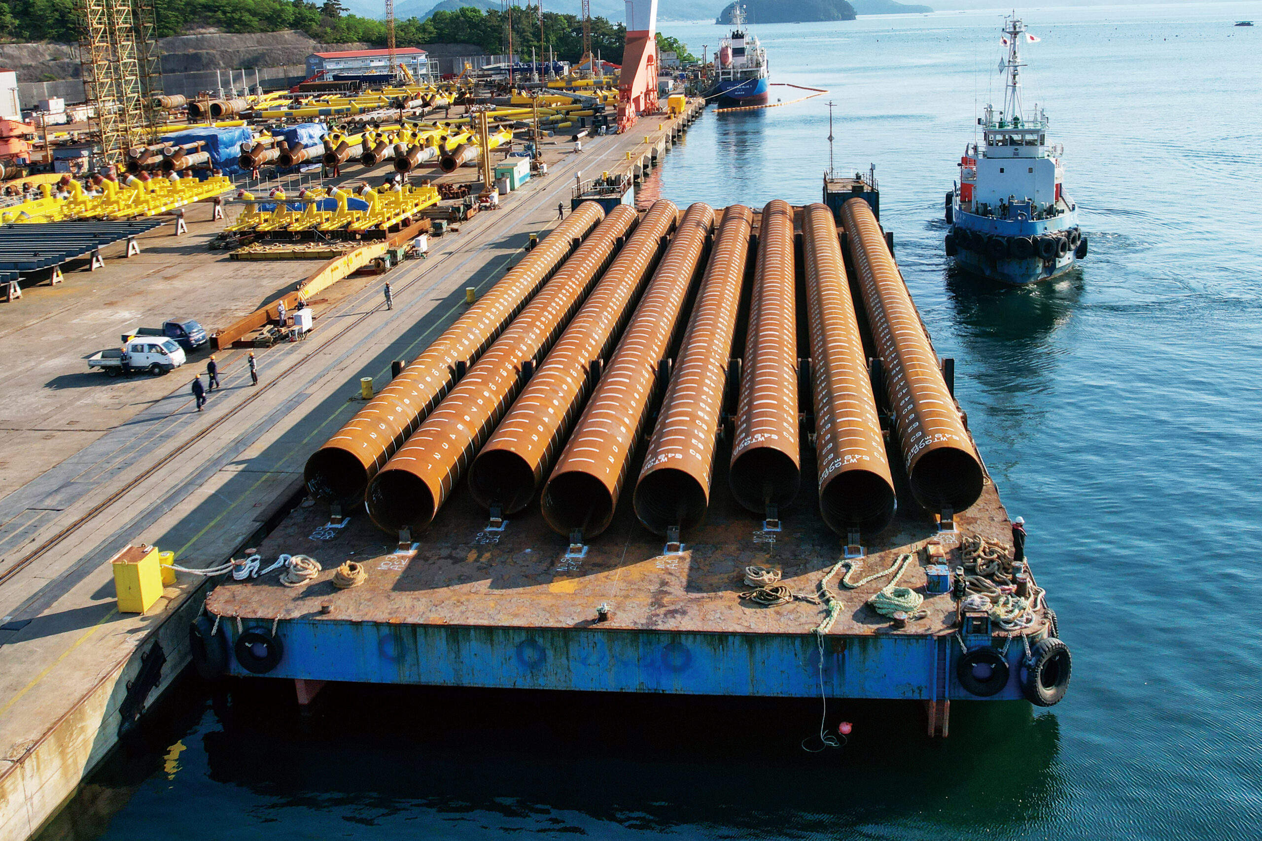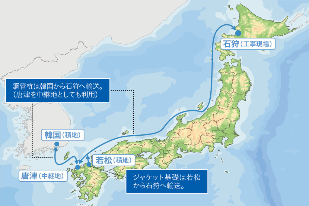 海底に打設し、風車全体を支えるた めの鋼管杭は、輸送の利便性やコストの関係などで、韓国から石狩まで直行せず、唐津で沿海(国内)専用のタグボートに切り替えることに。
