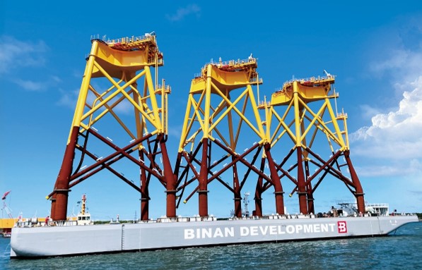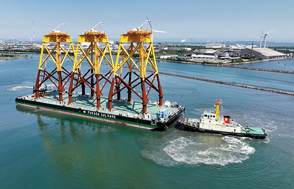 また、鋼管杭の上に設置し、風車のタワー部分を支えるための基礎となるジャケット式基礎。計12,000tもの輸送が求められ、10,000tを運べるクラスのデッキバージ※が必要で、その確保に苦労しました。